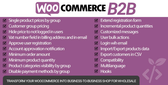 Download Best Seller “WooCommerce B2B” from Codecanyon for category “woocommerce”. Related Tags: b2b, business, category visibility, customer groups, discounts, ecommerce, hide prices, minimum amount, moderate registration, vat number, wholesale, woocommerce, wordpress